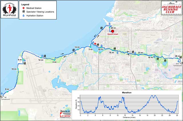 The 26.2 mile course begins in the heart of downtown Anchorage. Runners head west on 6th Avenue, north on H Street, then straight ahead on Christensen Drive to 2nd Avenue where the course turns left to join the Tony Knowles Coastal Trail. They run past Westchester Lagoon, Earthquake Park, Postmark Drive and Point Woronzof. Runners turn around at a point formerly known by locals as “the Blue Bridge.” They run back north to Westchester Lagoon where they bear right (east) on the Chester Creek Trail. From the Chester Creek turnaround (the roundabout at the base of the hill beyond, or east of, the bridge to East High School) runners return to the lagoon and head back to the finish line in downtown Anchorage.